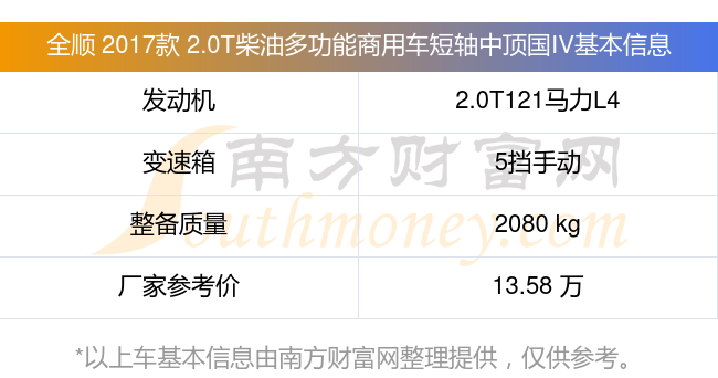 全順 2017款 2.0T柴油多功能商用車短軸中頂國IV動力方面,搭載的是一臺2.0T121馬力L4渦輪增壓發(fā)動機,匹配5擋手動擋變速箱,燃料形式為柴油,常規(guī)整備質(zhì)量2080kg,廠家參考價13.58萬元。