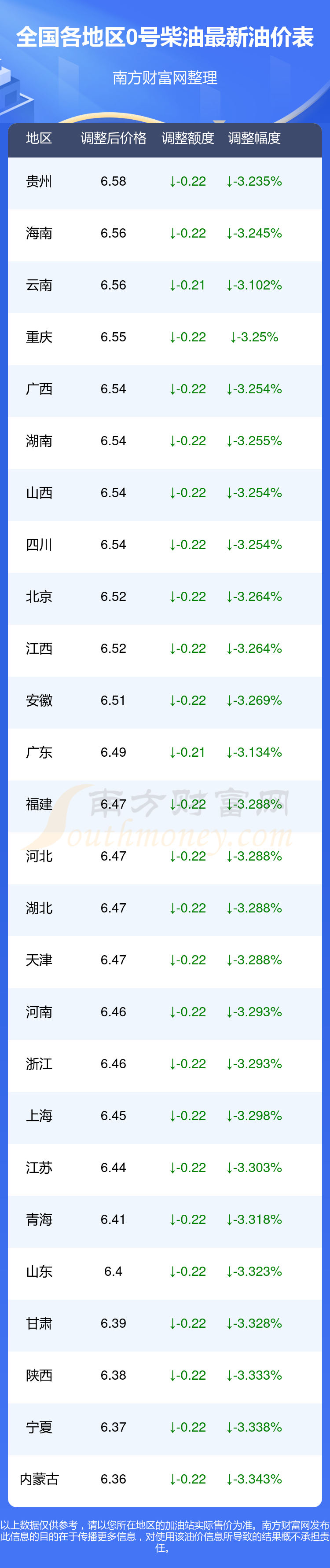 全國各地區(qū)最新0號柴油油價表