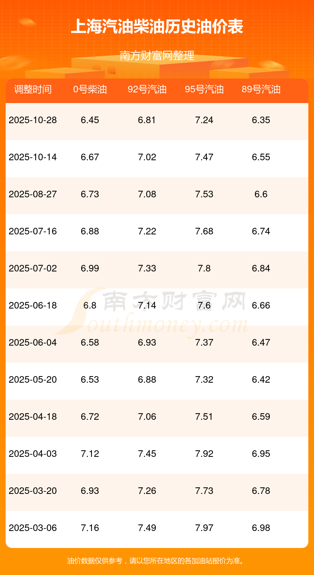 以上數(shù)據(jù)僅供參考,請(qǐng)以您所在地區(qū)的加油站實(shí)際售價(jià)為準(zhǔn)。南方財(cái)富網(wǎng)發(fā)布此信息的目的在于傳播更多信息,對(duì)使用該油價(jià)信息所導(dǎo)致的結(jié)果概不承擔(dān)責(zé)任。