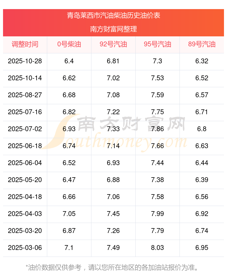 2025年青島萊西市汽油價(jià)格一覽表