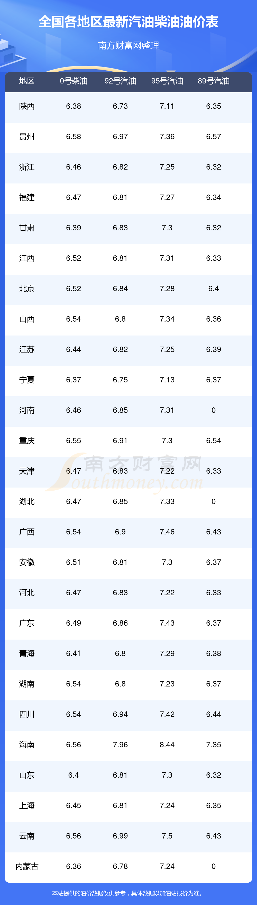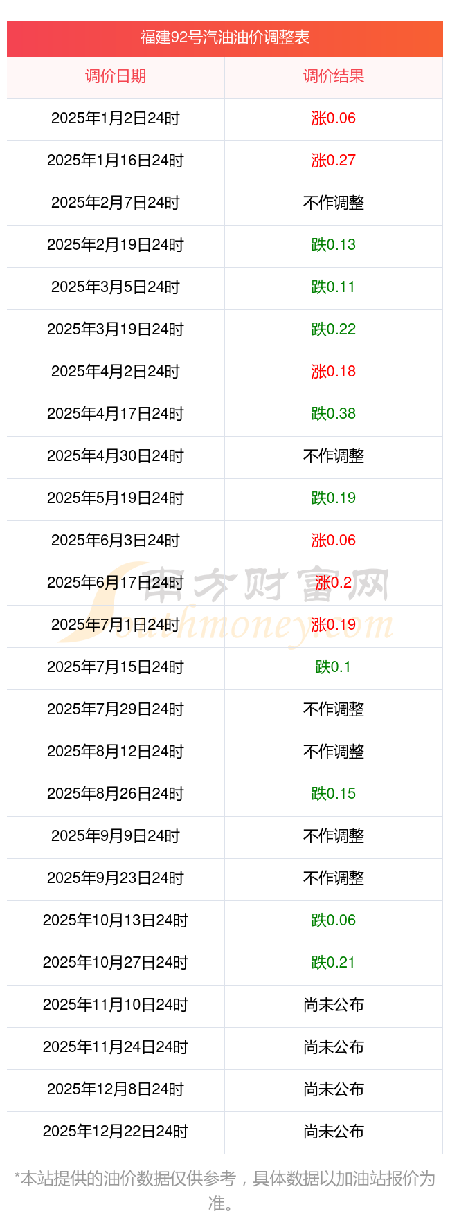油價數(shù)據(jù)僅供參考,請以您所在地區(qū)的加油站報價為準。南方財富網(wǎng)發(fā)布此信息的目的在于傳播更多信息,對使用該油價信息所導(dǎo)致的結(jié)果概不承擔任何責任。