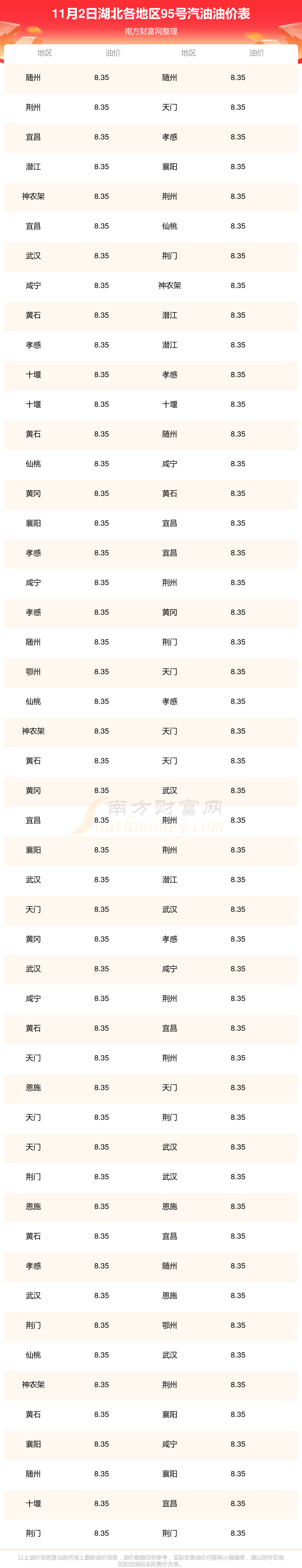2025年11月2日湖北95號(hào)汽油最新價(jià)格一覽表