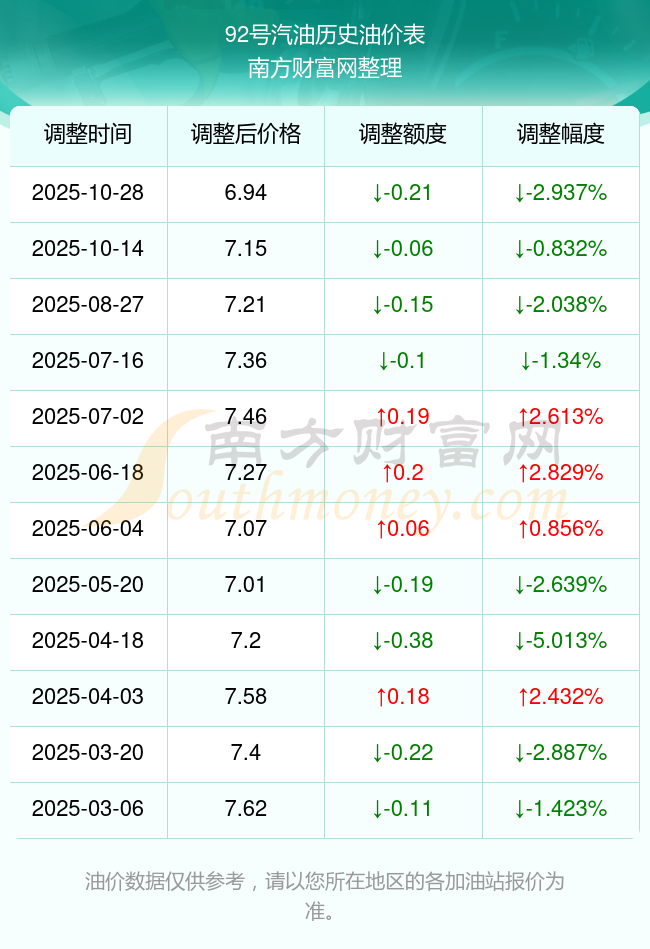 11月2日汽油柴最新油價是多少?具體每升為:10月28日調(diào)整后,92號汽油為6.94元,下跌了0.21元,下跌幅達(dá)2.94%;95號汽油為7.42元,下跌了0.23元,下跌幅達(dá)3.01%;89號汽油為6.44元,下跌了0.2元,下跌幅達(dá)3.01%;0號柴油為6.54元,下跌了0.22元,下跌幅達(dá)3.25%。下一輪油價調(diào)整時間11月10日24時,距離現(xiàn)在還有8.95天。