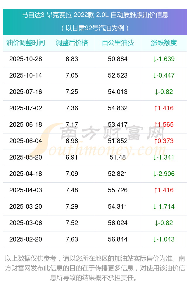 按10月28日92號汽油最新調(diào)整價(jià)格6.83元每升來計(jì)算(以甘肅為例),該車型百公里平均油費(fèi)為50.884元,按上一輪10月14日調(diào)整價(jià)格7.05元每升來計(jì)算,百公里平均油費(fèi)為52.523元,對比上一輪少花1.639元,下一輪油價(jià)調(diào)整時(shí)間為11月10日24時(shí)。