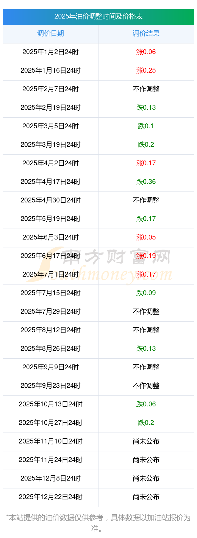 油價調整最新消息:下一輪油價調整時間11月10日24時。金牛區(qū)汽油、柴油11月2日每升最新價格為:92號汽油為6.94元;95號汽油為7.42元;89號汽油為6.44元;0號柴油為6.54元,調整時間為10月28日。