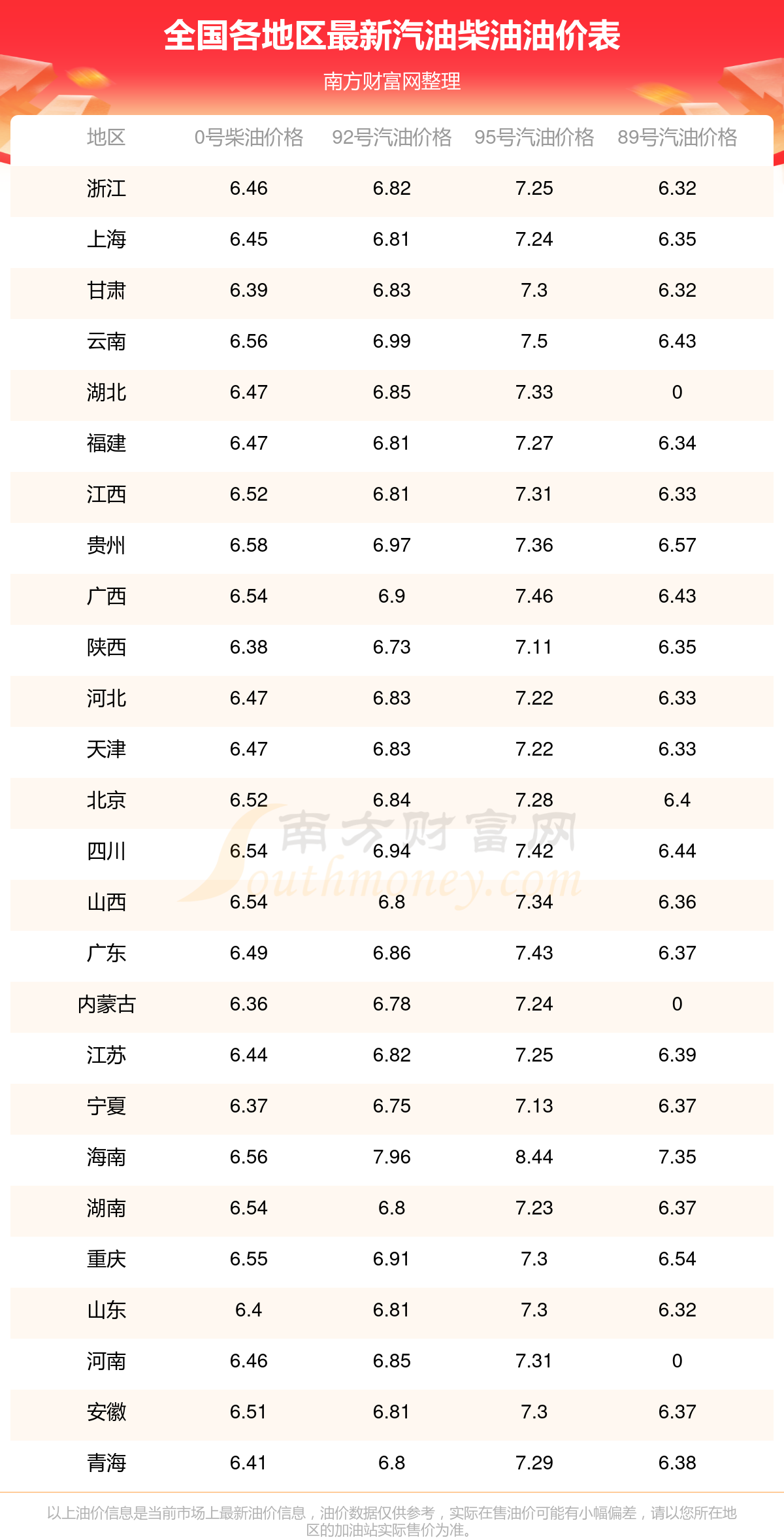 以上數(shù)據(jù)僅供參考,請(qǐng)以您所在地區(qū)的加油站實(shí)際售價(jià)為準(zhǔn)。南方財(cái)富網(wǎng)發(fā)布此信息的目的在于傳播更多信息,對(duì)使用該油價(jià)信息所導(dǎo)致的結(jié)果概不承擔(dān)責(zé)任。