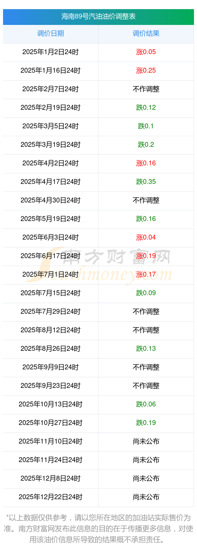 海南?谄筒裼11月2日每升的價格為10月28日調(diào)整后的價格,各油價詳情如下:92號汽油7.96元;95號汽油8.44元;89號汽油7.35元;0號柴油6.56元。海南?下一輪油價調(diào)整時間11月10日24時,距離現(xiàn)在還有8.95天。