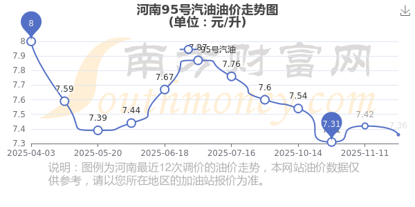 11月30日,河南95號汽油的價格是7.36元每升,本次的調(diào)整時間為11月25日,對比上次的調(diào)整跌了0.06元,跌0.809%,12月8日24時為下一輪油價調(diào)整時間,還有8.45天。