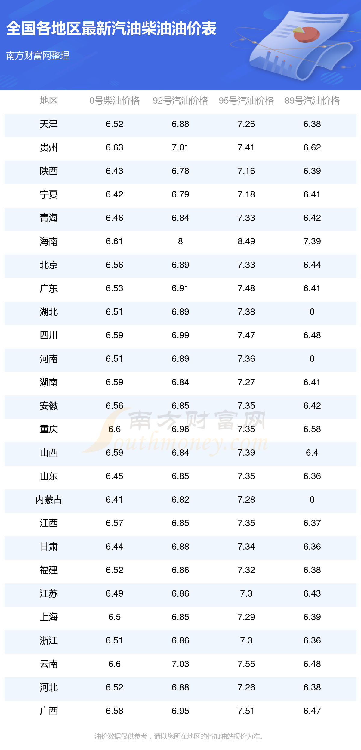以上數(shù)據(jù)僅供參考,請(qǐng)以您所在地區(qū)的加油站實(shí)際售價(jià)為準(zhǔn)。南方財(cái)富網(wǎng)發(fā)布此信息的目的在于傳播更多信息,對(duì)使用該油價(jià)信息所導(dǎo)致的結(jié)果概不承擔(dān)責(zé)任。
