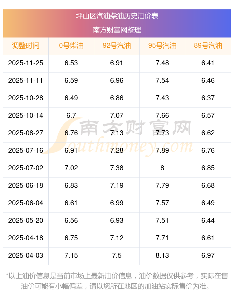11月30日,坪山區(qū)汽油、柴油每升最新價格為(11月25日調(diào)整后的價格):92號汽油為6.91元,降了0.05元,降幅達(dá)0.72%;95號汽油為7.48元,降了0.06元,降幅達(dá)0.8%;89號汽油為6.41元,降了0.05元,降幅達(dá)0.77%;0號柴油為6.53元,降了0.06元,降幅達(dá)0.91%。