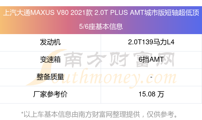 在動力上,上汽大通MAXUS V80 2021款 2.0T PLUS AMT城市版短軸超低頂5/6座配備的是一臺2.0T139馬力L4渦輪增壓發(fā)動機,匹配的是6擋AMT自動檔變速箱,燃料形式為柴油,廠家參考價15.08萬元。