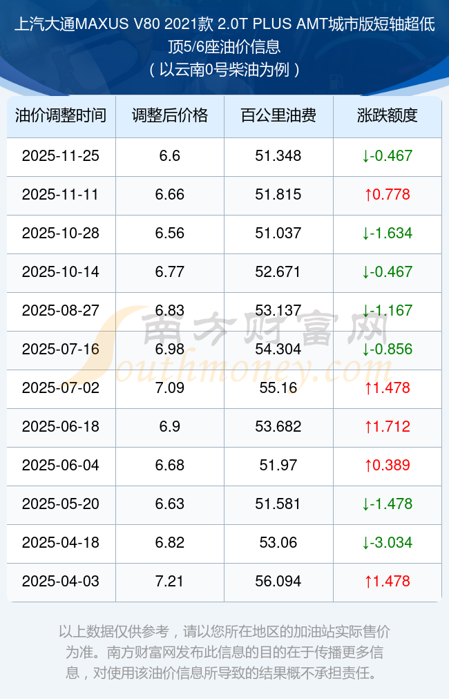 根據(jù)11月25日0號柴油最新調(diào)整價格6.6元/升來計算(以云南為例),該車型每百公里的平均油費是51.348元,上一輪11月11日調(diào)整價格6.66元每升來計算,每百公里的平均油費是51.815元,對比上一輪少花0.467元,下一輪的油價調(diào)整時間是12月8日24時。