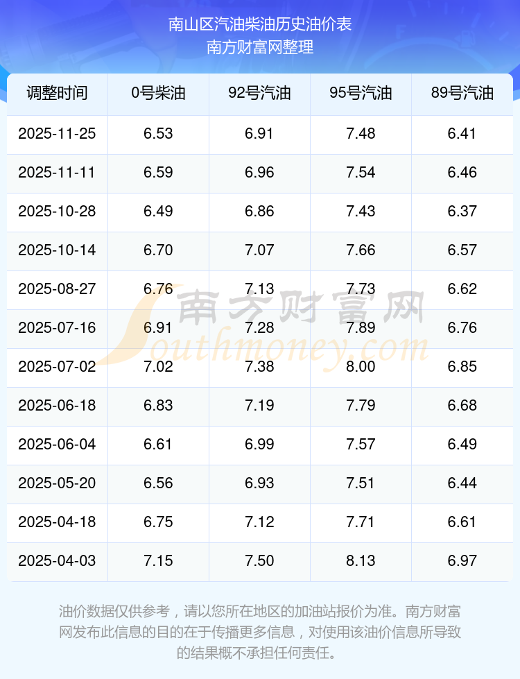 南山區(qū)汽油、柴油11月30日每升的價(jià)格為11月25日調(diào)整后的價(jià)格:92號(hào)汽油6.91元;95號(hào)汽油7.48元;89號(hào)汽油6.41元;0號(hào)柴油6.53元。