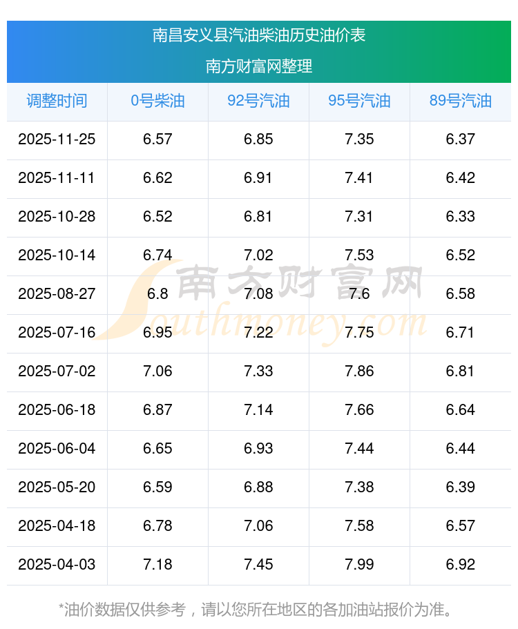 油價調(diào)整最新消息:下一輪油價調(diào)整時間12月8日24時。南昌安義縣汽油、柴油11月30日價格多少錢一升?具體為:0號柴油為6.57元,下降了0.05元;95號汽油為7.35元;92號汽油為6.85元;89號汽油為6.37元,調(diào)整時間為11月25日。