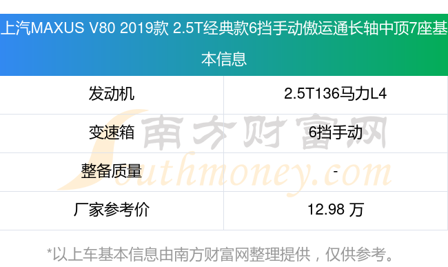 上汽MAXUS V80 2019款 2.5T經(jīng)典款6擋手動(dòng)傲運(yùn)通長軸中頂7座搭載了一臺(tái)2.5T136馬力L4渦輪增壓發(fā)動(dòng)機(jī),采用6擋手動(dòng)擋變速箱,廠家參考價(jià)12.98萬元。