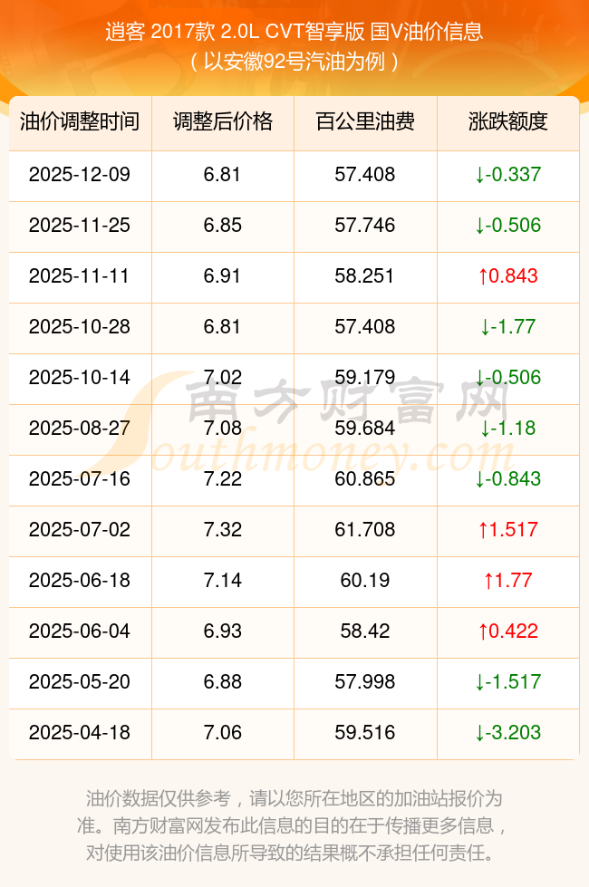 按照12月9日92號汽油最新調(diào)整價(jià)格6.81元/升來計(jì)算(以安徽為例),該車型百公里平均油費(fèi)為57.408元,按照上一輪11月25日調(diào)整價(jià)格6.85元/升來計(jì)算,百公里平均油費(fèi)為57.746元,對比上一輪少花0.337元,下一輪油價(jià)調(diào)整時(shí)間為12月22日24時(shí)。