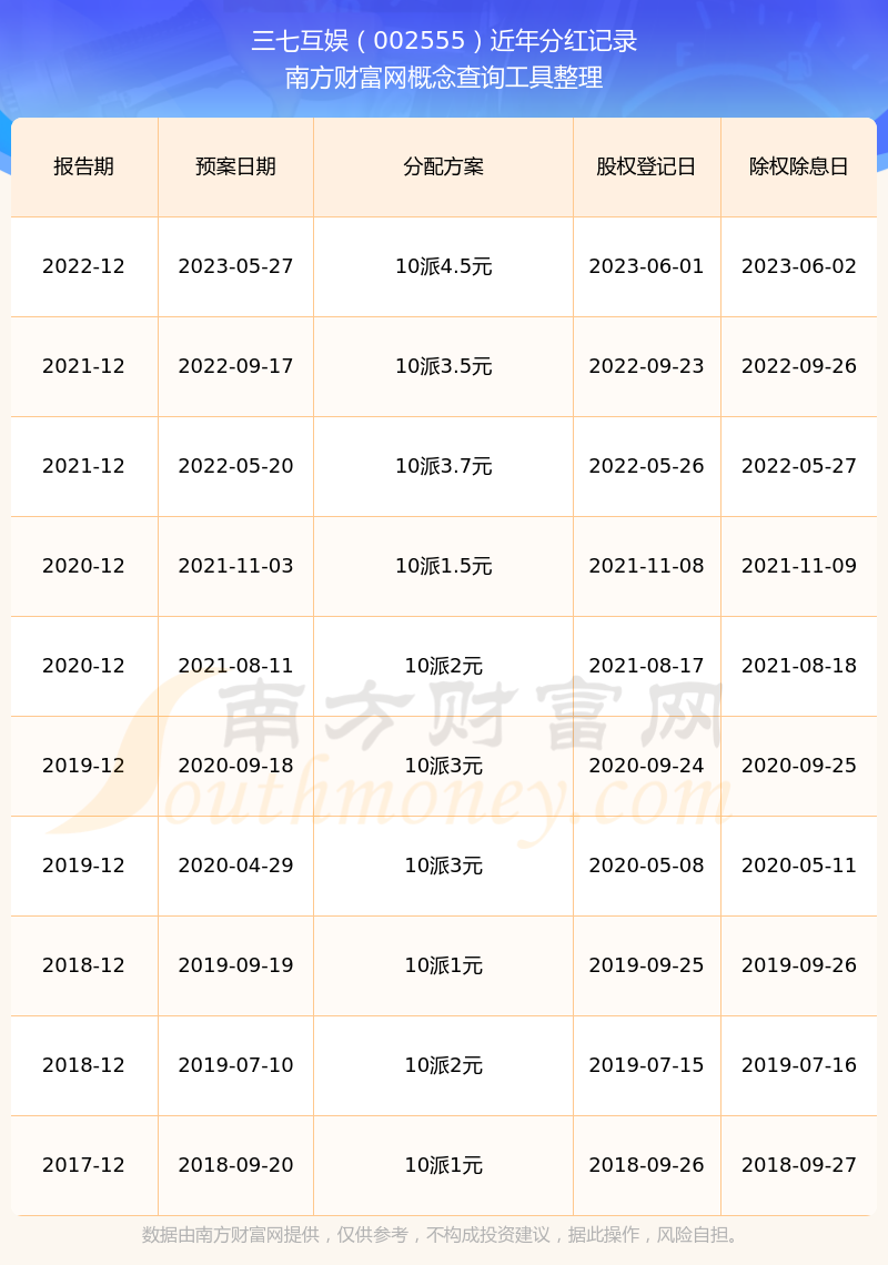 三七互娛最新一次公布的分紅方案:10派4.5元。