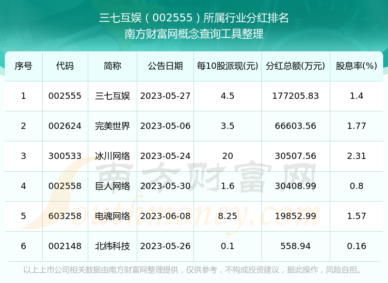 按照南方財(cái)富網(wǎng)趨勢(shì)選股系統(tǒng)統(tǒng)計(jì),三七互娛所屬行業(yè)為網(wǎng)絡(luò)游戲行業(yè),網(wǎng)絡(luò)游戲行業(yè)分紅排名情況如下表: