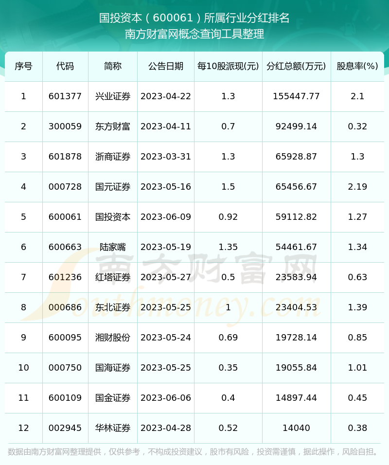 按照南方財(cái)富網(wǎng)趨勢(shì)選股系統(tǒng)統(tǒng)計(jì),國(guó)投資本所屬行業(yè)為證券行業(yè),證券行業(yè)分紅排名情況如下表: