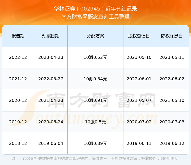 華林證券最新一次公布的分紅方案為10派0.52元。本次權益分派股權登記日為2023年5月10日,除權除息日為2023年5月11日,派息日為2023年5月11日。