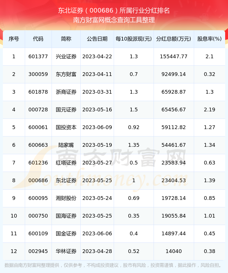 按照南方財(cái)富網(wǎng)趨勢選股系統(tǒng)統(tǒng)計(jì),東北證券所屬行業(yè)為證券行業(yè),證券行業(yè)分紅排名情況如下表: