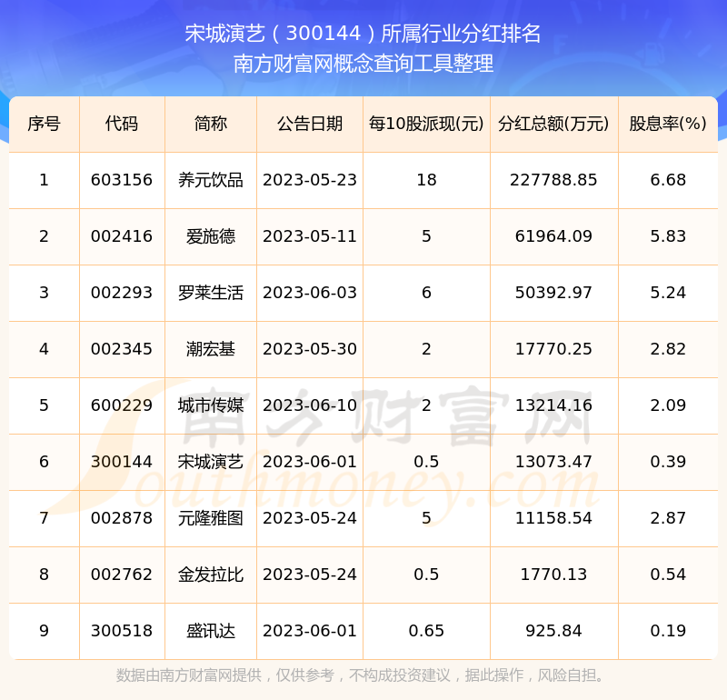 按照南方財(cái)富網(wǎng)趨勢(shì)選股系統(tǒng)統(tǒng)計(jì),宋城演藝所屬行業(yè)為旅游酒店行業(yè),旅游酒店行業(yè)分紅排名情況如下表: